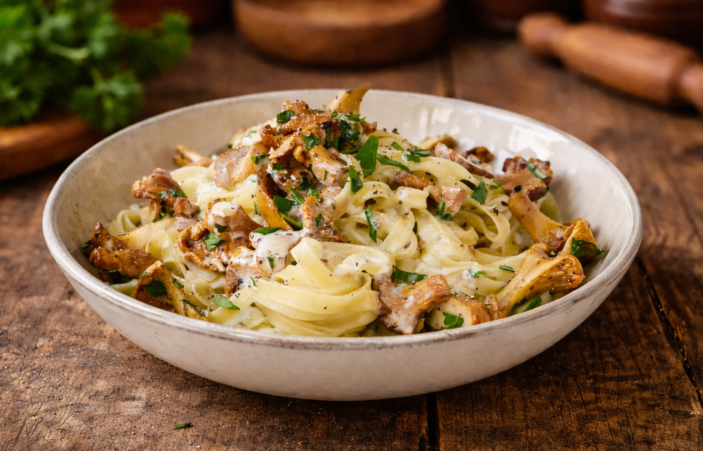 Wenn die Tage kürzer werden und die Pilzsaison beginnt, ist diese cremige Pasta genau das richtige Gericht. Kräuterseitlinge haben im Herbst Hochsaison – ihr festes, saftiges Fleisch und das fein-nussige Aroma passen perfekt zu einer milden Rahmsauce und frisch gekochter Pasta. Goldbraun angebraten entfalten die Pilze ihr volles Aroma und frische Kräuter setzen einen klaren Akzent, ohne den natürlichen Geschmack zu überdecken. Dieses Gericht steht für einfache Zutaten: eine unkomplizierte, wärmende Mahlzeit. Perfekt für den Herbst.