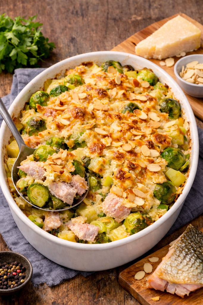 Knusprig gerösteter Rosenkohl trifft auf zartes Karpfenfilet – veredelt mit einer aromatischen Mandel-Parmesan-Kruste. Dieses Gericht verbindet winterliches Gemüse mit regionalem Fisch und schafft eine ausgewogene Kombination aus Röstaromen, feiner Nussigkeit und saftigem Filet. Die goldbraune Kruste sorgt für Biss und Tiefe, während der Rosenkohl mit seinem leicht herben Charakter einen spannenden Kontrast zum milden Karpfen bildet. Ein saisonales Ofengericht mit klaren Aromen – regional, hochwertig und überraschend harmonisch.